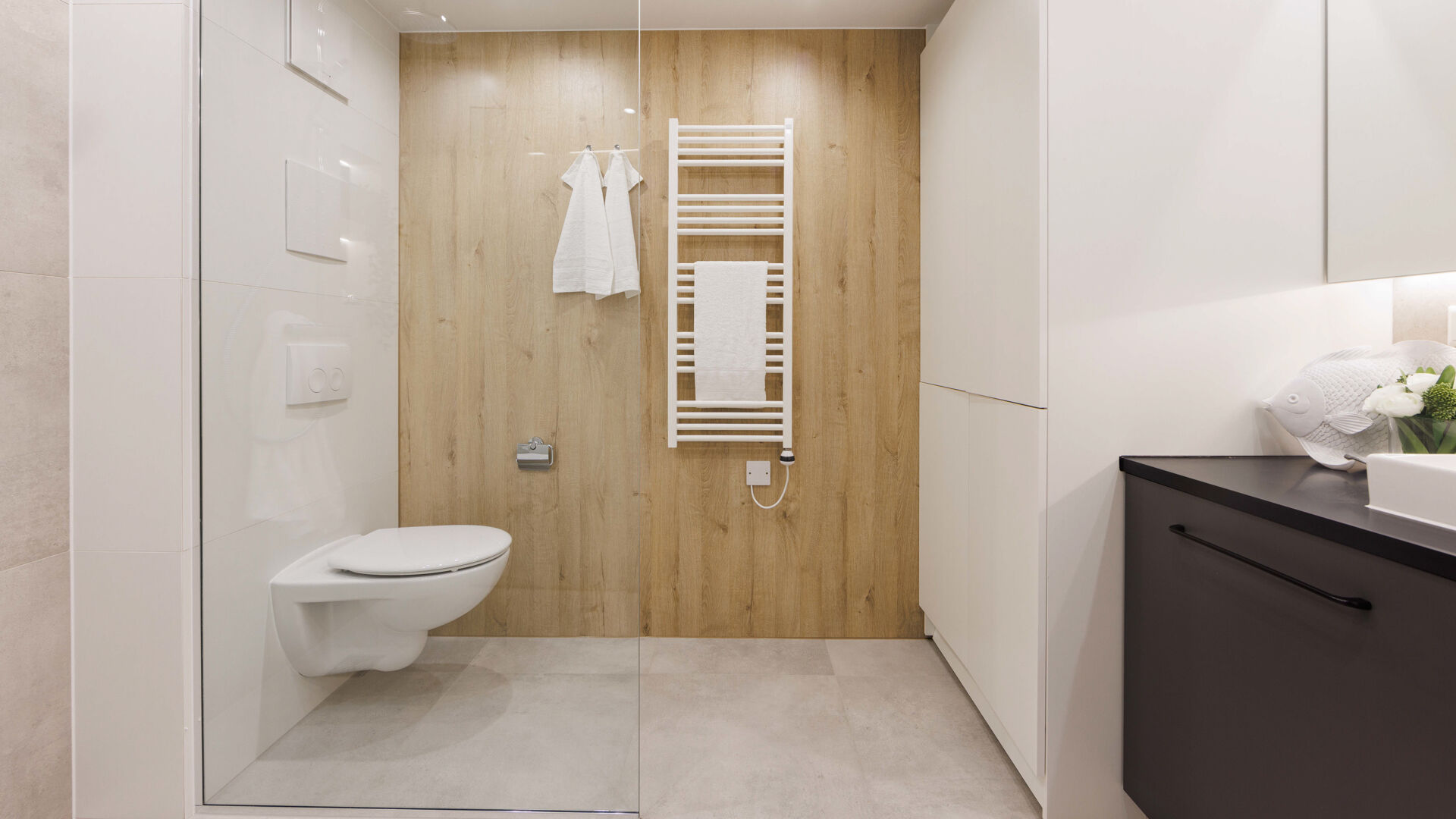 Das Badezimmer präsentiert sich als funktional und gleichzeitig elegant, mit einer bodengleichen Raindance-Dusche, einer modernen Waschtischanlage und einem integrierten Waschmaschinenanschluss, welcher praktische Handhabung verspricht.