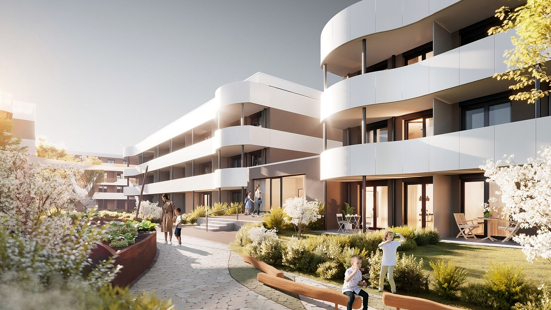 – Gestalteter Innenhof mit Wasserspiel und Spielbereichen